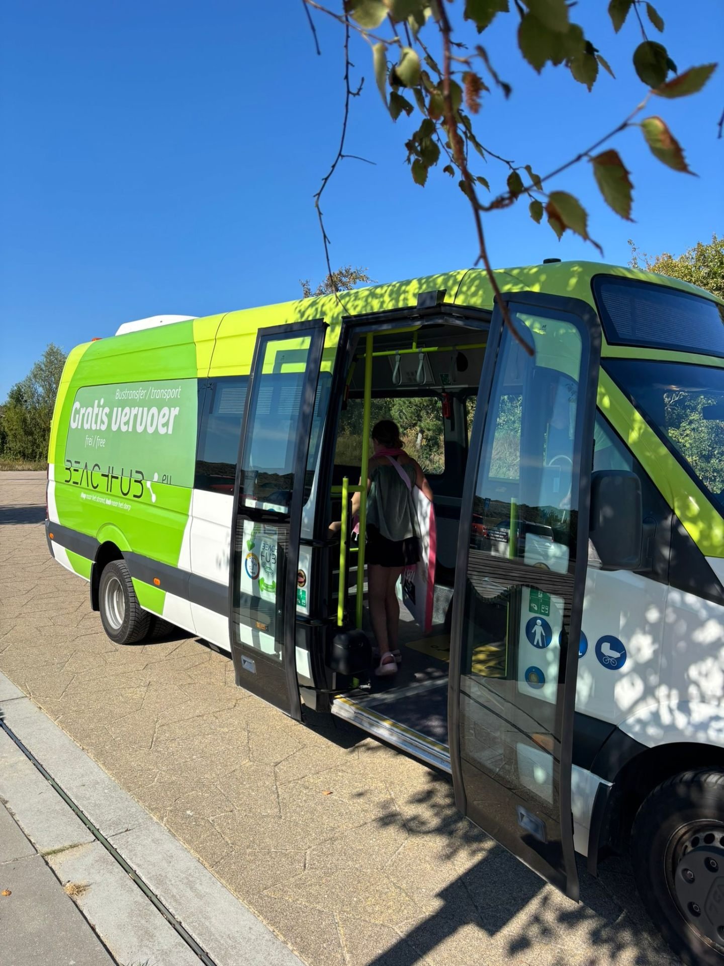 Gratis busje naar het strand in het hoogseizoen. Handig met kleine kinderen of strandspeelgoed!